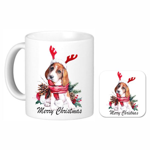 Christmas Mug and Coaster Set Featuring Beagle Puppy